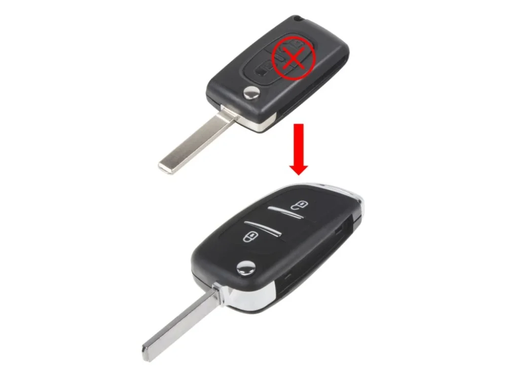 Náhradní obal vystřelovacího klíče pro vozy Citro\\u00EBn/Peugeot s 2-tlačítkovým vystřelovacím klíčem (bez elektroniky a čipu imobilizéru). Slouží pro změnu ze staršího vystřelovacího klíče na novější verzi. Do vystřelovacího klíče je nutno vložit z původního klíče elektroniku dálkového ovládání a čip imobilizéru (transpondér), planžetu klíče je třeba nechat vyfrézovat podle tvaru originálního klíče.